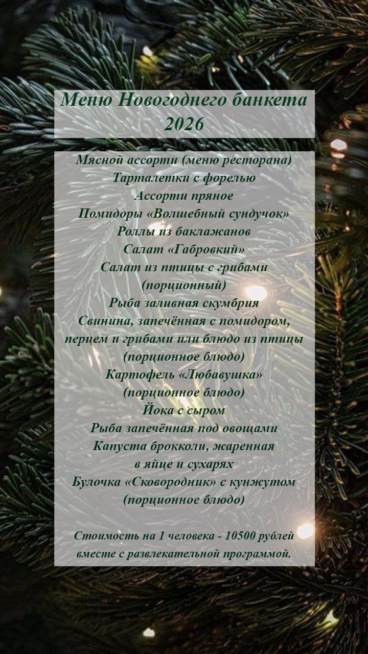 Алкоголь не включен в меню. Его можно заказать на месте или принести с собой.